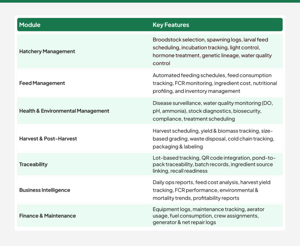 Aquaculture isn’t just about farming anymore, it’s about precision, transparency, and long-term viability, all of which are being redefined by Folio3 AgTech. The aquaculture management software by Folio3 Agtech is built to simplify complex operations, giving fish and shrimp farms complete visibility from hatchery to harvest. Here’s how it’s setting a new standard in aquaculture technology with its advanced set of features: