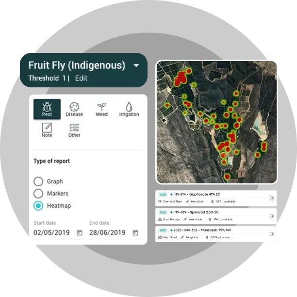 Monitor on-farm pesticide inventory, batch usage, and restock alerts based on spray plans and application logs.