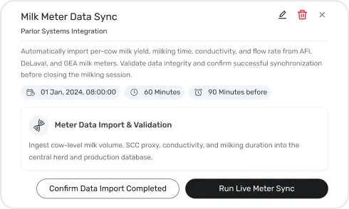 Record milk production, manage parlour workflows, monitor somatic cell counts, and track herd health, connecting your dairy ops to financial results.