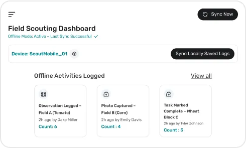 Equip your scouts with mobile GPS-tagged tools for pest, disease, and growth observations, synced instantly to records for precision agriculture action.