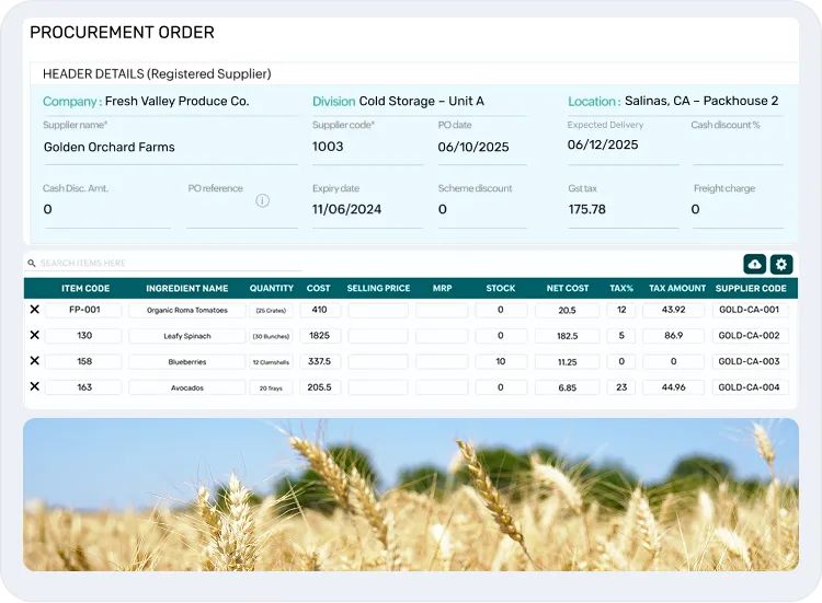 Your supply chain absorbs seasonal surges, perishable transport, and multi-vendor coordination. Manage the full procure-to-deliver cycle with Ag timing.