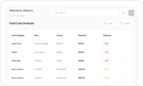 Monitor and compare costs across all areas of your farm. Ensure all resources are allocated effectively to maximize profitability.