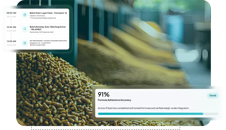 Keep feed production moving with accurate formulation, batching, real-time tracking, and full control over operations, all with a feed mill management software.
