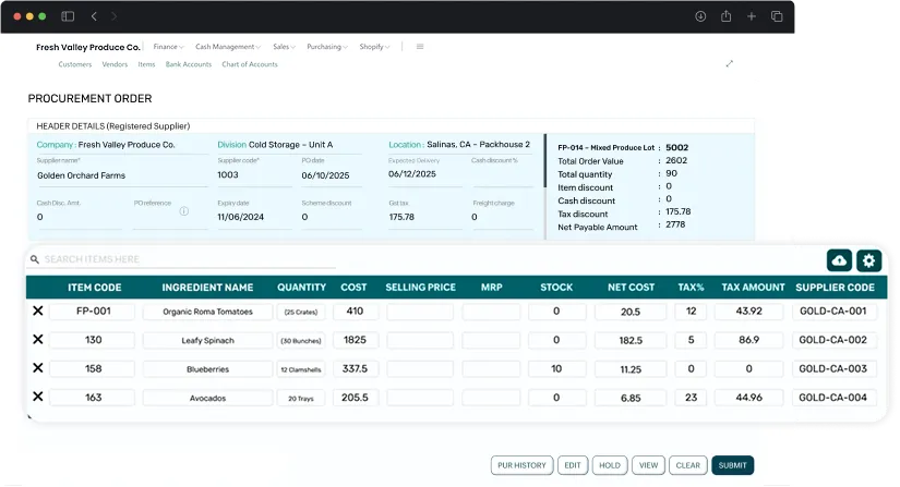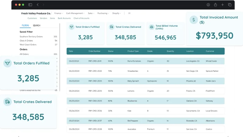 Yes, most fresh produce ERP systems offer built-in accounting modules or integrations with software like QuickBooks, NetSuite, or Microsoft Dynamics. This allows seamless syncing of sales, purchase orders, payments, payroll, and cost-of-goods data. It ensures accurate financial reporting and simplifies the handling of seasonal expenses, grower settlements, and vendor payments.