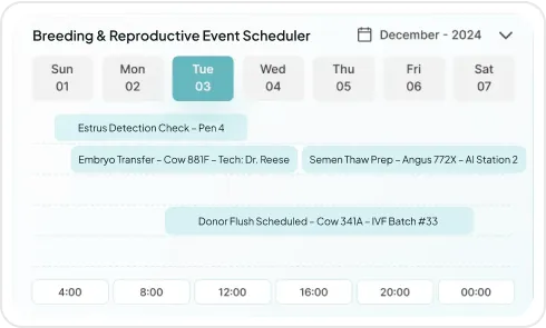 Plan, execute, and track every breeding event like AI, IVF, or embryo transfer, with complete visibility from cycle to offspring.