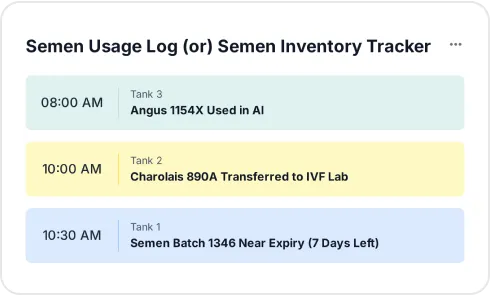 Monitor semen inventory, track usage by sire, and reduce waste with expiry alerts and usage insights.