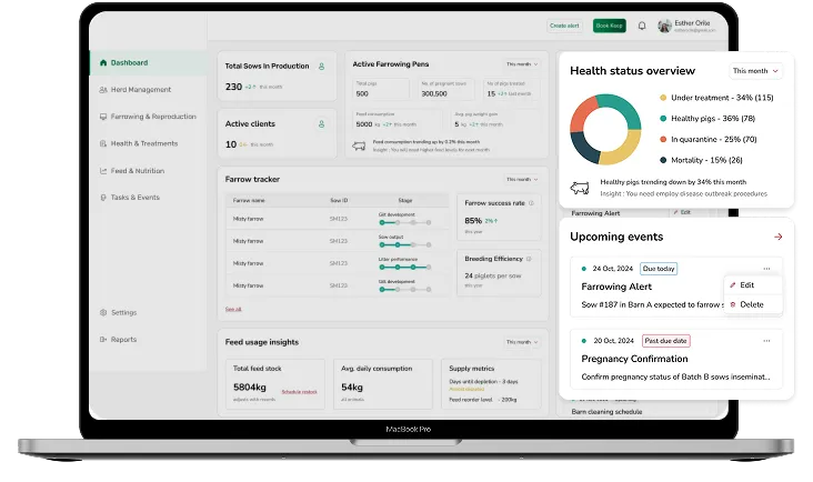 It should track sow performance, manage breeding schedules, and monitor piglet survival and growth by batch. It must log treatments, vaccinations, and health incidents with real-time alerts. Feed usage, mortality trends, and inventory movements should be visible in dashboards.